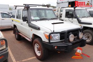2014 TOYOTA LANDCRUISER DUAL CAB, WHITE, 4x4, MANUAL, P/S, A/C, V8 TURBO DIESEL (REG#UNLIC) ODO# 320,376 KMS SHOWING ON CLOCK, VIN# JTEBV71J204006753, ENG# 1VD0260053, TRAY MOUNTED TOOLBOX, LIGHTBAR IN REAR, TOWBAR, REVERSE CAMERA, FL#03H7387, S44#RITM3468580, DR#64581, KEY#90 (W8962)