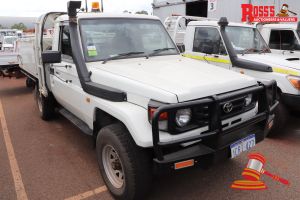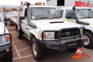 2009 TOYOTA LANDCRUISER TRAY TOP, WHITE, 4x4, MANUAL, P/S, A/C, TURBO DIESEL, REG#1DUO957 LIC: 30.4.20, ODO#357,780 KMS SHOWING ON CLOCK, VIN# JTELV71J300012850, ENG# 1VD0070808, BULLBAR, WORKLIGHTS, TOWBAR, DUAL TYRE CARRIER BUILT INTO TRAY, FL#LV159200, KEY#49 (W