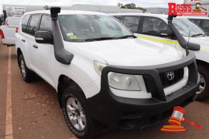 2011 TOYOTA PRADO WAGON, WHITE, 4x4, AUTO, P/S, A/C (REG#UNLIC) ODO# 178,057 LAST KNOWN KMS, VIN# JTEBH3FJ90K063066, BULLBAR, ALLOY RIMS, TOWBAR (NO HITCH) DUAL TYRE CARRIER/SPARE TYRE (NON RUNNER - ELECTRICAL ISSUES, REAR DRIVER'S SIDE PANEL DAMAGE) KEY#73 (W8989)