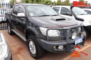 02/2012 TOYOTA HILUX SR5 DUAL CAB UTE, BLACK, 4x4, MANUAL, P/S, A/C, DIESEL D4D 3L, REG#1DVT985 LIC:29.02.20, ODO# 135,451 KMS SHOWING ON CLOCK, VIN# MR0FZ29GX01641938, ENG# 1KD5601075, ROO BAR, TOWBAR, SIDE STEPS (ACCIDENT DAMAGE TO LH REAR - LIGHT & PANEL DAMAGE, OTHER SMALL DENTS & SCRATCHES ON VEHICLE) KEY#97 (W8926)