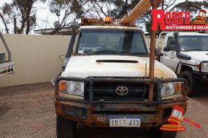 2011 TOYOTA LANDCRUISER TRAY BACK, WHITE, 4X4, MANUAL, P/S, 8 CYLINDER DIESEL, BULLBAR, SPOTLIGHTS, FIRE SUPPRESSION SYSTEM, ROOF RACK, 2 X TOOLBOXES, ROD TRAY, ROD RACK ABOVE TRAY, TOW BALL, ROLL OVER PROTECTION, WORKLIGHTS, REG NO - (UNLIC) ODO - CANNOT READ, ENGINE - 1VD0149838, VIN - JTELV71J300025081 (DR#5546)