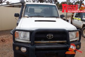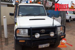 2008 TOYOTA LANDCRUISER TRAY BACK, WHITE, 4X4, MANUAL, V8 TURBO DIESEL, BULLBAR, SIDESTEPS, SUBTANK, TOWBALL, REAR WORKLIGHTS,SPARE TYRES, FRONT WRAP AROUND BARS, REG NO - (UNLIC) ODO - 218,028KMS SHOWING, VIN - JTELV71J200004982 (DR#5551)