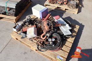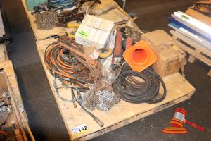 PALLET CONTAINING ASSORTED WELDING LEADS, CHAIN BINDERS & CHAINS & CHEMICAL DISPENSERS