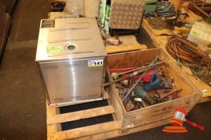 PALLET CONTAINING AUTOCLAVE STERALIZER (UNTESTED) & ASSORTED HAND TOOLS, PENCIL GRINDER & COME-A-LONG