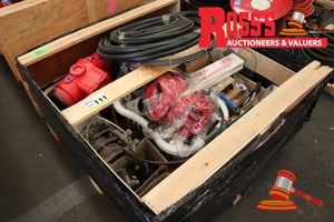 CRATE CONTAINING VARIOUS ITEMS, SOME INCLUDE; CO2 TRANSFER PUMP, ASSORTED GASKETS & SEALS, VARIOUS PVC FITTINGS, STAINLESS STEEL HOSE WITH FITTINGS, ABB CONTROL UNIT, 6 x HARD HATS , 60 x FIRE HYDRANT SIGNS