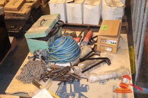 PALLET CONTAINING ASSORTED ITEMS, SOME INCLUDE; LIFTING CHAINS, STANDS & WELDER CABLES, ENERPAC PUMP & SIMPAC PULLER IN CASE