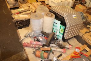 PALLET CONTAINING ASSORTED ITEMS, SOME INCLUDE;P PLASTIC WRAP WORK LIGHTS & TOOL BOX