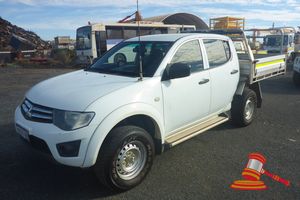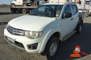 6/2013 MITSUBISHI TRITON GXL DUAL CAB TRAY BACK WHITE, 4X2, MANUAL, P/S, A/C, DIESEL, SIDESTEPS, 2 X TRAY MOUNTED ALLOY TOOLCHESTS, ALLOY DROP DOWN SIDES, CARRY RACK, ROPS, TWO WAY RADIO, TOW ASSEMBLY, REG NO - 1EFY896 (LIC 17/7/2021)ODO - 200,459KMS SHOWING, ENGINE - 4D56UCDZ7280, VIN - MMAJNKA40DD000963 (KS#) (**CONDITION REPORT - STONE & PAINT CHIPS ON BUMPER & BONNET, PAINT PEELING ON BOTH REAR PASSENGER DOORS, LIGHT UNDER CARRIER CORROSION, PAINT - POOR, PANEL, GLASS, UPHOLSTERY, FLOOR & DASH - FAIR, TYRES - POOR, OVERALL RATING - FAIR**)