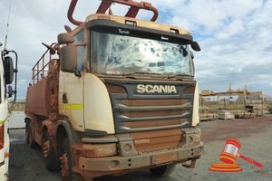 7/2014 SCANIA G400 SINGLE CAB WATER TRUCK , WHITE, 8X4, AUTO, P/S, A/C, DIESEL, FOP'S WORKLIGHTS, FITTED WITH APPROX 14000LTR WATER TANK WITH LARGE SPOUTED FILL INLET,(**DRIVE TRAIN FAULT/ISSUES WILL NOT DRIVE FORWARD OR REVERSE, VENDOR INFORMATION TAG**) HYDRAULIC DRIVEN SOUTHERN CROSS WATER PUMP, 3 X REAR MOUNTED FAN SPRAYS, DRIBBLE BAR, APPROX 20m X 1 IN HOSE ON RETRACTABLE REEL, TOP OF TANK MOUNTED WATER CANNON REG NO - (UNLIC) ODO - 427,927KMS SHOWING/17301HRS, ENGINE - DC1305L016827163 VIN - YS2G8X40005357951 (FL#04H3847) (S44#RITM2506151) (DR#64366) (**CONDITION REPORT - PANE, - FAIR, PAINT - POOR, GLASS - FAIR/GOOD, UPHOLSTERY, FLOOR, DASH & TYRES - FAIR, OVERALL RATING - POOR/FAIR**)