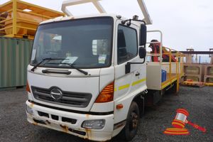 12/2013 HINO MODEL-FD7JFD1JSER2 C/CAB TRAY BACK, WHITE, (** NON RUNNER, MINOR SURFACE CORROSION TO UNDERCARRIAGE & LOWER PANELS, IGNITION ASSEMBLY UNSERVICEABLE**) 4X2, AUTO, P/S, A/C, DIESEL, REAR CHASSIS MOUNTED PALFINGER CRANE FOP'S, TOW ASSEMBLY, BUILT IN TRAY, STAIRS, REMOVABLE TRAY HAND RAILS, REG NO - (UNLIC), ODO - NOT SIGHTED, VIN - JHDFD7JPMXXX10376 (DA#3604-6688) (FL#21H12) (KS#3587) (**CONDITION REPORT - PANEL - FAIR, PAINT - POOR, GLASS - GOOD, UPHOLSTERY - FAIR, FLOOR - FAIR, DASH - POOR, TYRES - FAIR, OVERALL RATING - POOR/FAIR**)