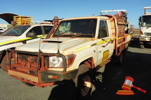 8/2012 TOYOTA LANDCRUISER WORKMATE, SINGLE CAB, TRAY BACK, WHITE, 4X4, MANUAL, P/S, A/C, V8 TURBO DIESEL, STEEL BULLBAR, SNORKEL, SIDESTEPS, 2 X TRAY MOUNTED CUPBOARDS, TOW ASSEMBLY, UNDERTRAY WATER TANK, ROP'S (**NON RUNNER, NO BATTERY, ENGINE BELTS REMOVED**) REG NO - (UNLIC) ODO - 234,097KMS SHOWING, ENGINE - 1VD0176899, VIN - JTELV71J100028660 (FL#03H6172) (S44#44543) (DR#64330) (KS#) (**CONDITION REPORT - PANEL - FAIR, PAINT - POOR, GLASS - FAIR/GOOD, UPHOLSTERY - POOR/FAIR, FLOOR - FAIR, DASH - FAIR, TYRES - GOOD, OVERALL RATING - POOR**)