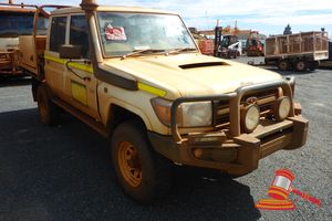 10/2014 TOYOTA LANDCRUISER WORKMATE DUAL CAB TRAY BACK, WHITE, 4X4, MANUAL, P/S, A/C, V8 TURBO DIESEL, STEEL BULLBAR, SPOTLIGHTS, SNORKEL, TOW ASSEMBLY, TRAY MOUNTED TOOL CHEST, ALLOY SIDESTEPS, REG NO - (UNLIC) ODO - 252,441KMS SHOWING, ENGINE - 1VD0266225, VIN - JTEBV71J904007446, FL#03R7518, S44#RITM4717601, DR#64931, (** CONDITION REPORT - PANEL DAMAGE TO DRIVERS SIDE DOOR & FRONT MUDGUARD, ENGINE WINDS OVER BUT UNABLE TO START, PANEL, UPHOLSTERY, FLOOR & DASH - POOR/FAIR, PAINT, POOR, GLASS & TYRES - FAIR, OVERALL RATING - POOR/FAIR**)