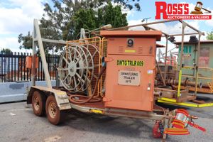 2011 DWATERING SUBMERSIBLE PUMP CONTROL PLANT TRAILER, GREY, DUAL AXLE (REG# UNLIC) FLAT HOSE REEL, 440W CONTROL PANEL, STAINLESS STEEL PIPEWORK, VALVES & SWITCHES, DEMAG ELECTRICAL HOSE RE.REELER WITH REDUCTION GEARBOX, ALUMINIUM GRID MESH, STABILISING LEGS, SUPPORT FRAME, VIN# NOT VISIBLE, FL# DWTGTRLR002, MEP-20210826-609 (W