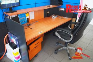OFFICE FURNITURE BUNDLE CONSISTING OF: 1 X RECEPTION DESK, TIMBER LAMINATE, APPROX DIMENSIONS: 1800mm W x 750mm D x 1110mm H; 1 x UNDER DESK CREDENZA, TIMBER LAMINATE, 3 DRAWER, LOCKABLE, NO KEY, ON CASTORS, APPROX DIMENSIONS: 465mm W x 460mm D x 690mm H; 1 x FILING CABINET, TIMBER LAMINATE, 2 DRAWER, APPROX DIMENSIONS: 900mm W x 600mm D x 720mm H; 1 x OFFICE CHAIR, ADJUSTABLE, ON CASTORS