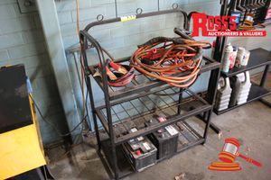 METAL DISPLAY/STORAGE RACK, 3 TIER, APPROX DIMENSIONS: 800mm W x 380mm D x 1030mm H; WITH 2 x HEAVY DUTY BATTERY JUMP CABLES; 1 x VEHICLE BATTERY JUMP LEADS; 2 X VEHICLE BATTERIES, CONDITION UNKNOWN