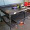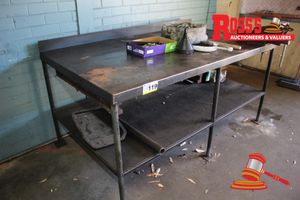 METAL WORKBENCH, CUSTOM MADE, 2 TIER, APPROX DIMENSIONS: 1830mm W x 1100mm D x 870mm H WITH MOUNTED BENCH VICE, MAKE: DAWN; PLUS MISCELLANEOUS CONTENTS.