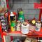 METAL DISPLAY/STORAGE RACK, 3 TIER, APPROX DIMENSIONS: 800mm W x 300mm D x 1400mm H; INCLUDING CONTENTS CONSISTING OF: 14 x BOTTLES OF DIESEL SYSTEM TREATMENT, 1 x BOTTLE OF OIL CONDITIONER, 1 x BOTTLE OF STOP LEAK; AND VARIOUS OTHER OIL AND PAINT PART USE