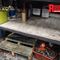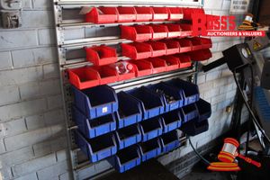 BUNDLE CONSISTING OF: METAL WORKBENCH, CUSTOM MADE, APPROX DIMENSIONS: 3700mm W x 915mm D x 950mm H; 1 x BENCH MOUNTED VICE, MAKE: IRWIN RECORD; 1 x 18 TRAY STORAGE UNIT & CONTENTS; 1 x OIL FILTER WRENCH SET IN PLASTIC CARRY CASE, APPEARS INCOMPLETE; 1 x COMPRESSION TEST KIT IN CARRY CASE, APPEARS COMPLETE; 9 x PLASTIC WATERING CANS; 4 x TUBS CONTAINING AN ASSORTMENT OF NUTS/BOLTS/WASHERS AND OTHER MISCELLANEOUSE