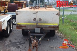 GREY, TANDEMAXLE (REG# UNLIC) S/N: UON011, PINTAL HITCH, TEAR AWAY BRAKES, OUTRIGGER LEGS, TOOLBOX, SPARE WHEEL CARRIER, PAD EYE TIE DOWN POINTS, CHECKER PLATE DECK, ELECTRIC/HYDRAULIC BRAKE ACTUATOR SYSTEM, T004 (WP395)