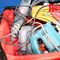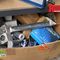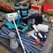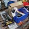 BUNDLE OF ASSORTED ITEMS INCLUDING BOSS WELD TIG LINE, MASK,ULTRA-SONIC DISTANCE MEASURER LASER, AIR SPRAY GUN, BOXOF GALVANISED COLLATED NAILS, TIE DOWN STRAP AND VARIOUS HAND TOOLS.