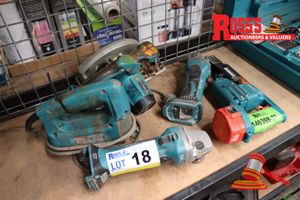 BUNDLE OF MAKITA POWER TOOLS INCLUDING COLLATED SCREW GUN WITH BATTERY, 2 X ANGLE GRINDERS, 1 X JIG SAW, 1 X CIRCULAR SAW (NO BATTERIES / NO CHARGER)