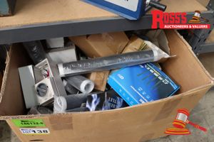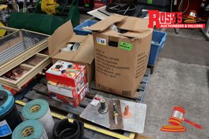 1 X PALLET CONTAINING 2 X BOXES OF ASSORTED PVC FITTINGS, PLASTER TOOLS, PAINT ROLLERS AND 1200mm DRYWALL SQUARE