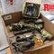 BOX OF 1 x BOSCH STAPLE GUN, HITACHI DV18DL CORDLESS DRILL SKIN, RYOBI CORDLESS DRILL SKIN, RYOBI BATTERY CHARGER + BATTERY ( x 2 ) RYOBI 240V HEAT GUN