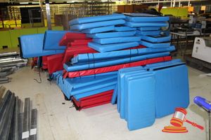 MADE IN CHINA, COMPRISING: HEAVY DUTY GALVANISED STEEL FRAME COMPONENTS INCLUDING; 3-WAY AND 4-WAY FEET/UPRIGHT SUPPORT BARS, APPROX 80mm X 75mm X 1000mm, CROSS RAILS/BRACES, APPROX 80mm X 40mm X 1330mm AND 40mm X 40mm X 1780mm AND SPRING FRAMES, APPROX 80mm X 50mm X 2300mm; LARGE QUANTITY OF HEAVY DUTY COMMERCIAL GRADE SPRINGS; 13 X TRAMPOLINE MATS, APPROX 1800mm X 1800mm, 2 X TRAMPOLINE MATS, APPROX 2860mm X 1800mm, 1 X TRAMPOLINE MAT, APPROX 4180mm X 1800mm; HEAVY DUTY COMMERCIAL GRADE ENCLOSURE INCLUDING 50mm DIAMETER POSTS X 2290mm L AND 50mm DIAMETER POSTS, APPROX 4800mm L, QUANTITY OF TOUGH POLYESTER NETTING, THICK SAFETY PADDING FOR POSTS, ULTRA THICK SAFETY PADDING, PADDED WALKWAYS AND BUCKET CONTAINING HEAVY DUTY GALVANISED NUTS AND BOLTS.NOTE: DISMANTLED. NO CONSTRUCTION MANUAL OR SET-UP PHOTOGRAPHS AVAILABLE. INSPECTION HIGHLY RECOMMENDED TO REVIEW ALL COMPONENTS. BUYER TO REMOVE AT OWN EXPENSE. SEE PRE - DISASSEMBLY INSPECTION REPORT PDF ON INFORMATION PAGE.