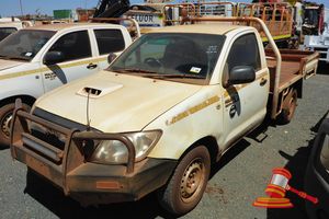 3/2011 TOYOTA HILUX SR DUAL CAB TRAY TOP, WHITE, 4X2, MANUAL, P/S, A/C, 3.0L D4D TURBO DIESEL, BULLBAR, 2 X SPOT LIGHTS, STEEL CHECKER PLATE TRAY WITH TOOLBOX, WORK/ FLASHING LIGHT, TOW ASSEMBLY,SEAT COVERS, ISOLATOR, REG NO - (UNLIC) ODO - 204,319KMS SHOWING, ENGINE# 1KD5300264, VIN# MR0EZ12G104011076, (FL#02P5371) (S44#RITM# 7820046) (DR#65872) (SK#314) (*NOTE - MINOR STONE CHIPS/SCRATCHES/INDENTS TO MOST PANELS PAINT SCRAPE LHS FRONT BUMPER, GLOVE BOX REMOVED (IN CAR) ROOF LINING MARKED, NO SPARE TYRES, RADIATED FILL CAP MISSING*)
