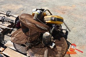 4 X WALL MOUNTED INDUSTRIAL FANS AND 2 X BARRIER REELS