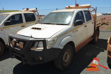 9/2012 TOYOTA HILUX SR DUAL CAB TRAY TOP, WHITE, 4X4, AUTO, P/S, A/C, 3.0 D4D TURBO DIESEL, SMARTBAR, WORKLIGHTS TOW ASSEMBLY, TRAY MOUNTED TOOLBOX, SIDESTEPS, SEAT COVERS, ISOLATOR, REG NO - (UNLIC) ODO - 221,262KMS SHOWING ENGINE# 1KD5895272, VIN# MR0FZ22G801068323 (FL#03H6705) (S44#RITM7833412) (DR#65874) (SK#288) (*NOTE - DRIVERS DOOR DAMAGED MINOR STONE/PAINT CHOPS ROOF LINING STAINED/ MARKED CORROSION SPOTS ON ROOF, LHS PASSENGERS DOOR PAINT DAMAGE (BROWN PAINT), PAINT SCUFFS ON ROOF, DRIVERS FLOOR DAMAGED*)