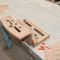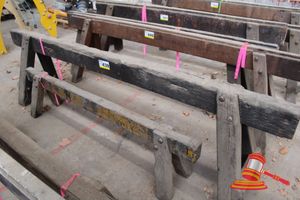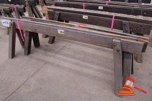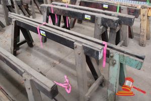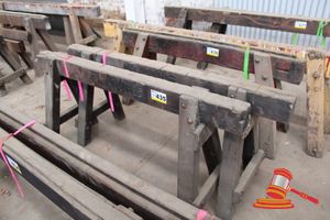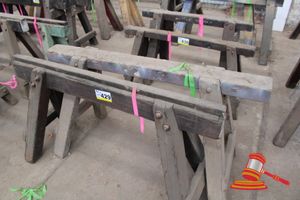 2 x TIMBER WORKSHOP SAW HORSES: 1 x MARKED NO. 119, APPROX 2240mm W x 790mm H AND 1 x MARKED NO. 147, APPROX 2440mm W x 730mm H