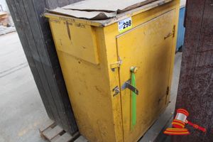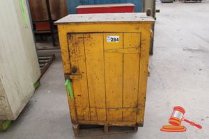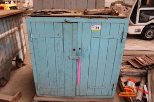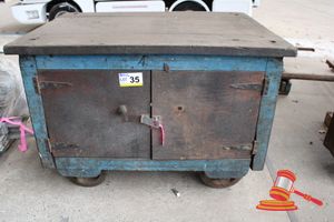 MOBILE WOODEN WORKSHOP CABINET WITH METAL BENCH TOP, 2 DOOR, APPROX 1280mm W x 915mm D x 1230mm H