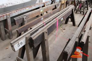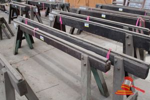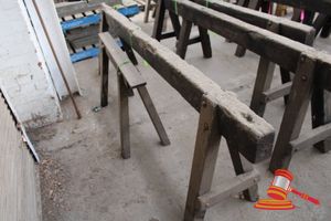 2 x TIMBER WORKSHOP SAW HORSES: 1 x MARKED NO. 50, APPROX 2440mm W x 760mm H AND 1 x MARKED NO. 69, APPROX 2440mm W x 750mm H
