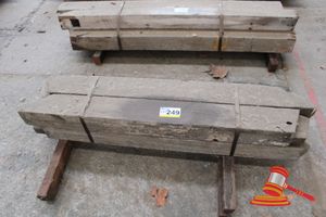 2 x TIMBER WORKSHOP SAW HORSES: 1 x MARKED P.J.J., APPROX 1670mm W x 440mm H, WITH 1 x PIECE OF TIMBER APPROX 2310mm L AND 1 x MARKED NO. 87, APPROX 1980mm W x 790mm H