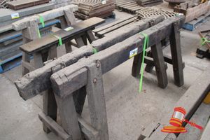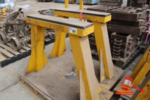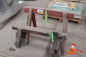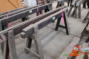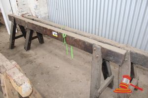 2 x TIMBER WORKSHOP SAW HORSES, MARKED FLANGE, APPROX 1720mm W x 790mm H