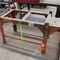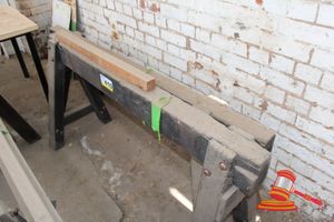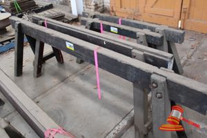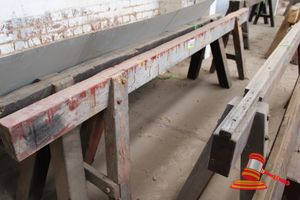 2 x TIMBER WORKSHOP SAW HORSES: 1 x MARKED NO. 121, APPROX 2440mm W x 770mm H AND 1 x MARKED NO. 39, APPROX 3045mm W x 740mm H