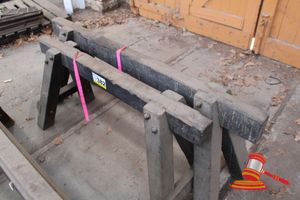 2 x TIMBER WORKSHOP SAW HORSES: 1 x MARKED W.M.O. NO. 31, APPROX 1830mm W x 790mm H AND 1 x 2450mm W x 730mm H