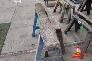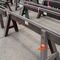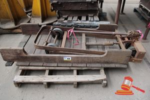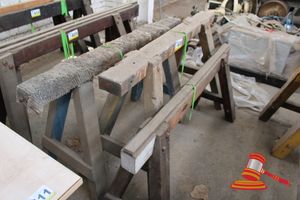 2 x TIMBER WORKSHOP SAW HORSES: 1 x APPROX 1680mm W x 430mm H, WITH 1 x PIECE OF TIMBER APPROX 2280mm L AND 1 x MARKED NO. 48, APPROX 2440mm W x 770mm H