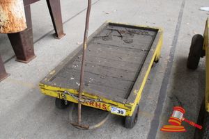 TIMBER WORKSHOP FLATBED TROLLEY, MARKED 19ARHS, APPROX 1330mm L x 700mm W x 395mm H