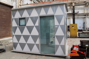 TRANSPORTABLE OFFICE, DOUBLE GLASS SLIDING DOORS, ONE KEY FOR ONE DOOR ONLY, ON METAL SKID, APPROX 3400mm L x 2300mm W, NOTE: DAMAGED. HIAB LIFT ONLY AT BUYERS OWN EXPENSE