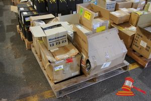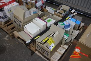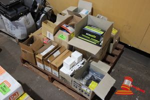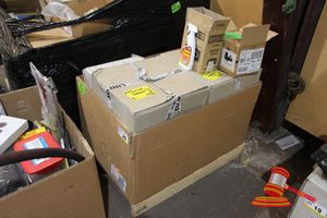 PALLET CONTAINING QUANTITY VARIOUS FLUORESCENT LAMPS, WIRE GRID KITS, SPEAKERS PROJECTOR AND MONITOR MOUNTING BRACTKETS, ETC