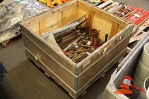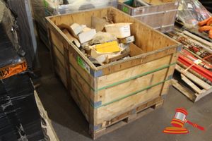 1 x WOODEN CRATE CONTAINING VARIOUS ITEMS INCLUDING: SIGNS, SMALL SPLAY BITS, PIPING, DRILL BITS AND SCABBLERS, (UNKNOWN QUANTITY)