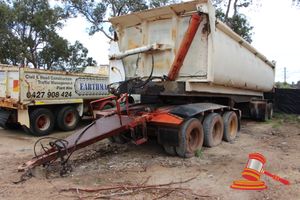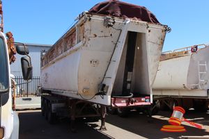 WHITE, 2 X BODY, 3 X DOLLY, 7 PIN ELECTRIC HOOK UP, RING FEDER HITCHES FRONT & BACK, DOLLY TURNTABLE, DOLLY DIMENSIONS: 7100mm Long, 3100MM WIDE, TRAILER/SIDE TIPPER DIMENSIONS: 11,600mm LONG, 3100mm WIDE, OVERALL LENGTH: 15,000mm LONG, CH# DOLLY - DL1074 / TRAILER 12649ASOME TYRES OLD & FLAT, RUST EVIDENT ON BODY/TIPPER/CHASSIS/RIMS, TOW HITCH ON DOLLY SEIZED, GREASE POINTS FOR SIDE DOOR UNATTACHED, NO TAIL LIGHTS(PLEASE NOTE WIDTH OF TRAILER FOR TRANSPORT, NO JOCKEY STAND FOR DOLLY A-FRAME, STAFF COULD NOT INSPECT INSIDE DUMP BODY