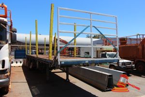 BLUE, TRIAXLE, TOWED, REG# UNLIC VIN# R08T1128783 (STAMPED INTO CHASSIS) 7 X BOLSTERS, AIR ACTUATED LOCKING PIN FOR EXTENSION, SPARE WHEEL HANGERS, WATER DRUM, TOOLBOX (WP837)EVIDENCE OF SURFACE RUST ON FLOOR