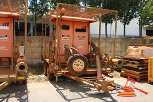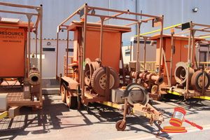 GREY, TANDEM (REG# UNLIC) S/N: 2595-TR-05, CARLISLE ELECTRIC BRAKE SYSTEM, COIL OF CUT TRAILING CABLE ON DRAWBAR, BATTERY BOX, DISTRIBUTION BOX, TRANSFORMER STARTER PANEL, FOLD DOWN WALKWAY, STABILISER LEGS, DN100 SPOOL WITH FLOW METER, TA1760 (BENT MUD GUARDS)