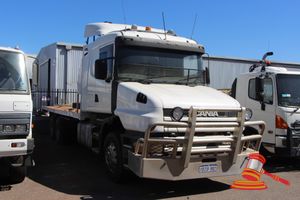 - 2002 SCANIA 124G FLAT TOP, WHITE, 6X4, MANUAL, P/S, A/C, DIESEL, REG#, ODO# 140,115 KMS SHOWING