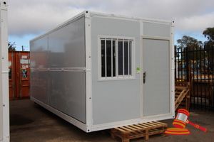 FLAT RACK, MODULAR BUIDLING, WINDOWS TO TWO ENDS WITH DOOR, INSULATED WALL AND ROOF PANELS, BASIC WIRING CHASED THROUGH PANELS, LIGHT GREY EXTERIOR PANELS 5820mm x 2490mm x 2520mm