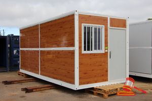 FLAT RACK, MODULAR BUIDLING, WINDOWS TO TWO ENDS WITH DOOR, INSULATED WALL AND ROOF PANELS, BASIC WIRING CHASED THROUGH PANELS, TIMBER VERNEER LOOK TO OUTSIDE PANELS, 5820mm x 2490mm x 2520mm