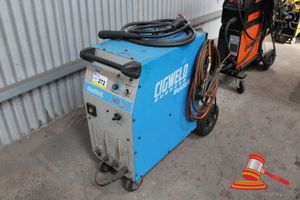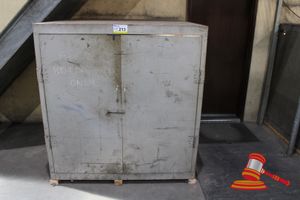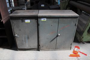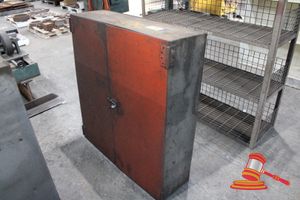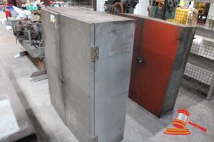 STEEL STORAGE CABINET, 2 DOOR, APPROX 1670mm x 1270mm x 1400mm, FOR WELDING WIRE STORAGE, INCLUDING 4 x ROLLS OF ESAB 1.2mm DUAL SHIELD 7100S, AS NEW, 1 x ROLL OF KISWEL 1,2mm FLUX CORE K-800HT, AS NEW, AND 1 x ROLL OF CIG ALUMINIUM 0.9mm WELDING WIRE, AS NEW.